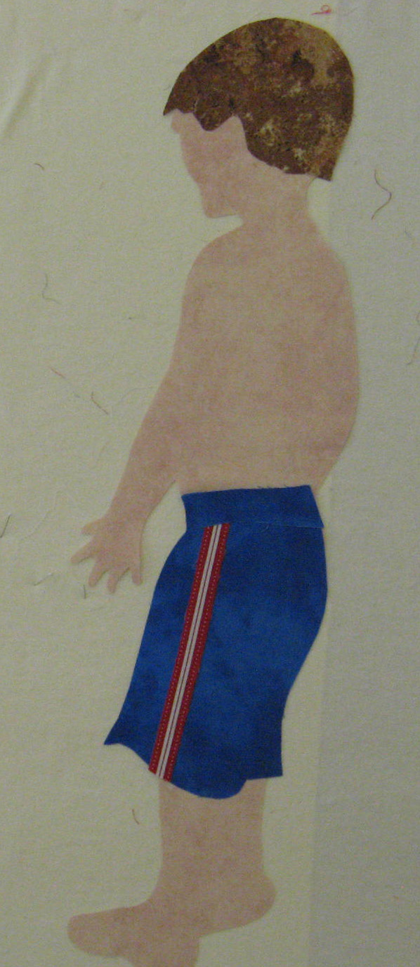 The last couple of days have been spent finishing up the background painting and experimenting with various ways to put shadows and shading on my figures. On the original quilt, I shaded with tulle fused onto the little boys' figures and made shadows beneath them, on the sand. This is effective, but very tedious!